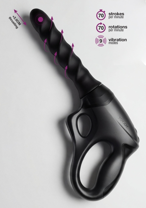 Jellemző pisztolymarkolata határozott, könnyed irányítást biztosít, míg a szabadalmaztatott 360°-ban forgó, lökő és rezgő tengely örvénylő belső érzést kelt, amely minden másodperccel erősödik. Az erőteljes lökőmozgás akár 2,5 cm-t is elér, percenként 70 lökést biztosítva, ami percenként 70 fordulattal kombinálva mélyen magával ragadó élményt nyújt. Akár egyenletes pulzussal, akár merész csavarással vezeti, a PRO+ veszélyesen sima forgása és lökése parancsoló pontossággal reagál vágyaira, míg 9 rezgési mód rengeteg lehetőséget kínál, hogy illeszkedjen a hangulatához. Kéz nélküli használatra vágyik? Szereld fel az állítható tapadókorongos állványra, és rögzítsd bármilyen sima felületre, így a Cadence Fatale PRO+ egy teljes értékű szexgéppé alakul, amely készen áll a csúcspont elérésére.